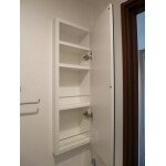 配管位置の関係で、ご希望の手洗いを付けるのが難しい状態でした。 トイレから分岐して取付ができる手洗器がありますので、そちらをお薦めし、コンパクトなデザインにすることで狭さを感じないよう工夫しています。 配管も同じクロスで囲み、気にならないようにプランしました。 収納は埋め込みにしていますので、圧迫感がありません。