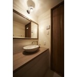 洗面台は陶芸がお好きな奥様が選ばれた焼き物のボウルに合わせてアンティーク調の照明やボーダータイルなどをご提案し、こだわりの造作洗面台に仕上がりました。 洗面台の幅は100センチと広々としており、ゆったりとご使用いただけるように。 カウンターと収納はメラミン化粧板を使用し、お手入れがしやすいように工夫しました。 また、広々とした1面鏡は施主様の支給品で、木枠がアンティークな空間を演出しています。 造作洗面台は家具屋さんで製作し設置いたしました。