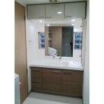 洗面ボールと水栓、下部キャビネットを交換取付けし、壁と床を貼り替えました。木目調で高級感のある洗面脱衣スペースに生まれ変わりました。