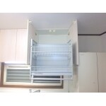 最新のキッチンはほとんどが引き出し式の収納の為、奥まで入れたモノが上から見渡せ、出し入れの際も姿勢が楽です。また、手が届き難い吊り戸には、昇降タイプのユニットを設置したので無駄なく収納が出来ます。