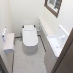 白で統一し、デザイン的にも機能的にも優れたトイレになりました。 カウンターてすりと、紙巻器の上も手をつけるので立ち上がりもラクラクです。