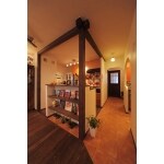 キッチンは陽気なイメージを演出するため、キッチン扉もタイルも元気のある色を使いました。化粧梁と柱で作ったパーゴラはリゾートの雰囲気を醸しながら空間を自然に区切っています。キッチンの幅は決して広くはありませんが、キッチン背面と横には収納スペースを確保し、ダイニング側には飾り収納を設けることでゆとりある空間に仕上げました。