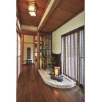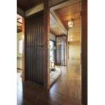 旅館を思わせる広縁にある坪庭は和の趣を最大限に引き出しました。廊下に設えたお客さまお気に入りのマッキントッシュの椅子もこの空間に溶け込んでいます。