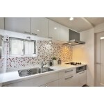 キッチンの正面の壁にハート型のタイルを使用し、かわいらしさとデザイン性を兼ね備えたキッチンになりました。