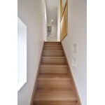 シンプルな階段には光を配慮し、窓やガラスブロックを設けました。また急だった階段の段数を増やし以前より緩やかになりました。