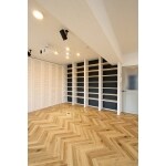 リビングダイニングはフルオープンのキッチンと一体で利用出来、ワークスペースも兼ね備えた広々とした大空間をプランニング致しました。 バルコニー側の柱にはイタリア製のタイルを張り、空間のアクセントにしています。テラコッタタイルの温かみとコンクリートの無機質な表情が楽しめるタイルです。 ご家族皆様でリビングで勉強できるようにスタディスペースをご用意しました。昼白色の集光タイプと電球色の拡散タイプの照明を組み合わせて集中的に照らし、床には机を置いた際に利用できるようにアップコンコンセントを取り付けています。壁面には壁いっぱいに本棚を造作しました。棚は可動が出来、シナランバーを利用することで木の色を出し、背面の壁にはブラックの壁紙をアクセントに張っています。背面が暗くなることで手前に置く本が際立つ効果を出しています。 リビングにも大型の収納を設けました。収納扉はヘリンボーンの床と相性の良い無垢材の通風ルーバー折れ戸を採用しました。表情のある建具なので、リビング空間のデザインのポイントになっています。 リビングには天井にプロジェクターとスピーカーを取付け、オーディオシステムを楽しむことが出来ます。