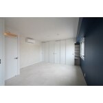 洋室は将来、中央に壁を造作して仕切ることを想定し、開き扉を2セット取り付けています。開き扉の上部には明かり取りと通風のための滑り出し窓を取付け、レバーハンドルはリクシルオリジナルの商品からカワジュンの商品に付け替え、シンプルでありながらレトロなデザインに仕上げています。 床はふわふわとした触り心地が気持ちの良い、東リのタイルカーペットを採用しています。糊付けしていないので部分的に交換することができます。 窓側の壁面はご選定いただいたブルーの塗装で仕上げています。マットな質感がタイルカーペットの雰囲気とマッチし、落ち着いた印象になっています。 エアコンは先行配管で納め、壁面にはエコカラットを馬張りで部分張りしています。 巾木を取り付けていないため、室内がすっきりとした印象で仕上がっています。