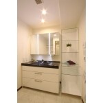 洗面台はPanasonicのラシスを採用しました。右隣のリネンケースはお客様のご要望で華奢なアクリル板にて造作しました。圧迫感を与えることなく、空間を上品に仕上げています。