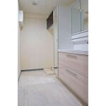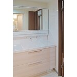 システムバスの出入り口は気を付けていても濡れてしまいますが、洗面所の床を耐水性のある専用のフローリングを採用したので安心です。洗面化粧台は全面引出し収納で収納力抜群で、物で溢れることを改善しました。自動水栓で便利です。