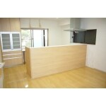 築30年で、暗い台所と圧迫感のあるリビング。奥様のご要望により台所とリビングの間仕切りを無くして広々開放的なリビング・ダイニングにリフォーム。広さを損なわないようキッチンはシンプルな対面式に交換。台所に居ながら家族のコミュニケーションも出来るようになりました。筋交いのある白い壁には大きさの違う正方形の棚を設けアクセントに。階段下のスペースにニッチ棚を設置し、限られたスペースの有効活用にも貢献しています。
