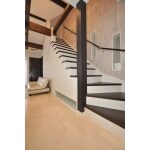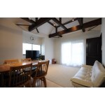 ダイニング同様リビングの頭上も最大限に高くした天井に組んである梁に塗装を施したうえに照明を設置し、小屋根部屋に続くコントラストの強い階段と共に空間を引き立てカフェ気分を味わえる空間になりました。
