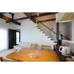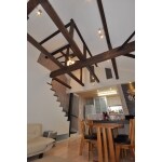 ダイニングの頭上には最大限に高くした天井と梁に塗装を施し照明を設置する事によりカフェを思わせる大空間に変身しました。