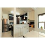 壁を取り払い、対面式のカウンターキッチンにする事でキッチンからダイニングへの動線を解消。また収納スペースをバランスよく配置する事で圧迫感を取り除き、使いやすい空間になりました。