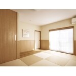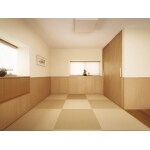 納戸となっていた2階の和室を、間仕切りを取り払って、お客様をもてなすセカンドリビングとして改修しました。壁と天井は珪藻土仕上げ、畳は縁無しの半畳タイプに取り替え、廻り縁もなくしてモダンな印象に一新。アクセントになっている白木の腰壁は、傷や汚れ防止もかねています。また、入口の床には、表面に凹凸加工が施された無垢の板を採用。一歩、足を踏み入れた時に、その変化が足裏から伝わる、おもてなしの仕掛けです。 遮光生地を備えたプリーツスクリーンを採用することで、よりモダンな印象を生み出している。