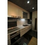 キッチンの床にはパール調のタイルを貼り、照明の光が乱反射するような仕上がりにしました。 天井のダウンライトを増やすことにより部屋全体が明るくなりました。