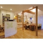 和室や広縁などを合わせて広々としたリビングダイニングに変えました。平屋の構造を活かし、リビングは吹き抜けにしています。LDKの中央にご主人の書斎スペースを造作。床面から一段上がってLDKを見渡せるコックピットのような書斎です。ご夫婦共働きでなかなかご家族のコミュニケーションをゆっくり取れないことがお悩みだったCさまは、コックピット書斎と対面キッチンにより、そのお悩みが解消されたと喜んでくださいました。 ダイニングスペースは天井を取り払って吹き抜けにし、開放感を演出。横の広がりだけでなく縦の広がりも感じられるLDKです。 コックピット書斎の壁は空間に圧迫感を与えないようR壁にし、タイルで作ったクローバーはご家族の記念としてCさまが施工されました。また、その下にはご家族の手形も入れて、思い出の詰まった空間が完成しました。