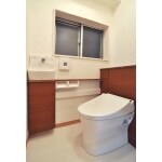タンクレストイレの背面には配管を隠すために収納壁を設置し、スッキリしたデザインになりました。手洗い器の設置に伴いカウンターと収納を設置し、トイレ背面の収納壁と素材を合わせ、落ち着いた空間になりました。