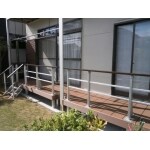 希望は南面の部屋同士を行き来することを考えた全長約7.4M、奥行約1Mの大きなものでしたそれに布団が干せるような手摺りをつけ、さらに昇降のための階段も設置。ウッドデッキ下部にコンクリート土間打ちし雑草の悩みがないよう配慮しました。