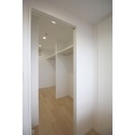 洋間(6畳)をウォークスルークローゼットに改装。 改装の際、既存の壁位置を変更し廊下幅を広げたため多少面積を縮小しましたが、ハンガーパイプ&棚を設置したため収納力は十分です。 玄関からリビング入口までつながるウォークスルークローゼットは、外出の際通り抜けながら上着を着る、帰宅の際は荷物を置いてリビングへ、などが出来、大変便利です。