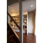 今回のリフォームで広すぎた奥行を暮らしやすい大きさへ変更したことにより、このギャラリースペースを設けることが出来ました。 食器棚と背中合わせの特注書籍棚には、ご主人の蔵書が並んでいます。天井と棚の隙間は透明ガラスで仕切り、明るい光を分散させました。
