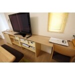 特注の家具は大型テレビ、PCスペースに。奥様の作業スペースを確保しました。