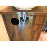 洗面台部分はお客様の希望に合わせてオーダー製作し、ダストシュート用の穴をつけるなどこだわりました。