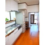 清潔感のある明るい扉カラーのキッチンに、木目の映える水廻り向けの床材を採用しました。