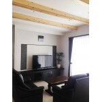 解放感を出すため、天井高2700mmと高く設定することをご提案しました。 また、重厚感を出すために化粧の集成梁を天井に使用しています。 お子さんも小さいので、調質性のあるエコカラットをテレビの裏に採用しました。TVボードも周辺部材に合わせ、作り付けにしています。