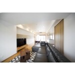 リビングと隣接している和室を解体して空間を広げ、たくさんの人が集まれるリビングが実現しました。 すっきりとするようにリビングクローゼットを設け、収納面も配慮しました。 フローリングとダイニングテーブルは、サントリー「樽ものがたり」です。 長い間ウイスキー貯蔵に使った樽から生まれた、あたたかくて重厚な無垢の建材で耐久性にも優れています。 リビング空間のアクセントにモザイクタイルを貼り、おしゃれに仕上がりました。 また、施主様がショールームで見て気に入られたトーヨーキッチンスタイルの照明とソファで上質な空間にコーディネートされました。 もともとの天井高を活かし間取りを変更することで、開放的なリビング空間に仕上がりました。