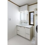 (旧ミサワリフォーム関西中部株式会社での事例です。)洗濯機と洗面化粧台のスペースもクリナップのSという商品を活用し収納量を確保しながら一体感のあるすっきりしたデザインになりました。