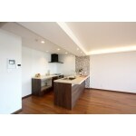 独立型だったキッチンをフルフラットの対面型キッチンにしました。吊り棚がないので、より空間が広く感じられるデザインとなっています。 ブラックのレンジフードと壁面のタイルがアクセントとなりキッチン全体を引き締めています。