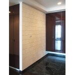 玄関には鏡とエコカラットを施工しました。 エコカラットの凹凸は一枚一枚異なります。 目地幅を広く取りることで仕上がりに微妙な変化ができて、照明により美しい陰影が生まれます。