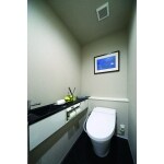 タンクレストイレのサティスを設置しました。 手洗い器は様々なサイズや収納パターンが選べる「キャパシア」のフロートキャビネットを選定されました。 フロートキャビネットは、足元がスッキリとしているので空間を圧迫することなく手洗いカウンターを設置することができます。 パールブラックの人造大理石カウンターで、高級感のある印象に変わりました。 今回、水廻り全体の位置を変更し、洗面化粧室とトイレの間に扉は設けず、ホテルのようにつながる空間にリフォームしました。