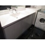 洗面ボウルが洗面カウンターより上に位置しているため、 水はねの掃除がしづらい。 また、既存より大きな洗濯機に交換するので、 その上の台座を撤去したい。
