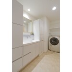 洗面台に設けた鏡は木枠の一面鏡をIKEAで購入。ナチュラルかつ上品な仕上がりになりました。 洗面脱衣室の建具はスライドドアを採用。空間を最大限に活かすのはもちろん、ドアに手を挟みにくく小さな子どもにも安心です。