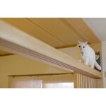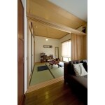 和室とリビングを仕切る引戸は写真左隅の食器棚裏の壁にスッキリと収納できます。しっかりとした板の間を広めに設け、昭和な家具を飾っていただけるスペースにしています。 キャットウォークになるよう作った和室の鴨居。しっかりとした質感になるよう、大きさにもこだわりました。最初は塗装するつもりでしたが、あまりにも木目が綺麗だったのでそのまま使用する事に。