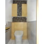 背面に収納があるTOTOレストパルを設置し、上部にも収納スペースを設置。 床と腰高壁にはハイドロセラフロアとウォールを使い、上部背面にはエコカラットを使用。 掃除しやすく、抗菌・消臭・調湿機能を兼ね備えたトイレになりました。