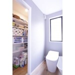 広いトイレを半分にして、トイレから入る収納をつくりました。お掃除用品やテッシュ、トイレットペーパーなどのストック庫としてお使いいただけるようになっています。