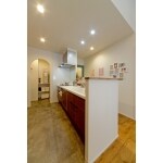 キッチンは向きを替えてよりリビングダイニングが見える仕様にしました。洗練されたデザインと使いやすく機能的なキッチン。奥にはアールのパントリーを設置し収納を確保。