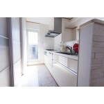 導線を考え、家事効率がUPするキッチンの間取りをご提案しました。 また、キッチンの奥には勝手口とウッドデッキを設置し、お庭への出入りも可能になりました。