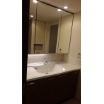 チャイルドミラー(水栓後ろにある横長の鏡)があるタイプの洗面化粧台でした。