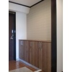 玄関ホールのリフォームです。木質感ある玄関収納と、収納上のクロスは一面をアクセントクロスとし表情をもたせています。