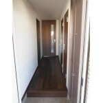廊下の床、建具の色をウォルナット系の色で統一。 壁紙のホワイトとのコントラストで、すっきり感を出しました。