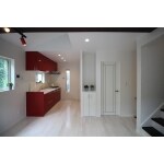 赤いキッチン&スポットライトとダークブラウンの梁を差し色に使用することで、お部屋全体の印象を引き締めました。YKKAPのペアガラスで断熱もバッチリです。