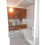 広くしたいとのことで、1216サイズ(0.75坪)から1616サイズ(1坪)に間取りを変更を提案させていただきました。天井が高いものを選び、1坪以上に広く感じる浴室になりました。また、ドアを引戸にしたため、洗い場に居ても開閉時に障害なく出入りが可能です。 白と木目の壁パネルに加えて蛍光灯の証明で温かさと明るさのある、あたたかい空間になりました。 床は「うつくしフロア」という凹凸が少ないのに、乾きやすく冷たさも感じにくい床材になっています。 パネルも床もフラットで凹凸も少なく、排水口や継ぎ目など細かいところも掃除がしやすいように設計されているので、毎日のお掃除の助けになります。