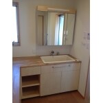 既製品の洗面化粧台の組合せでは収納量が足りない為、弊社工場で製作するオリジナル家具をおすすめしました。