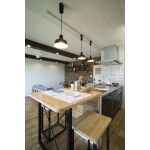・キッチンと横並びに配置したダイニング。 配膳や片付けも楽に出来ます。 ・キッチンの造作カウンターと同じ高さのカウンターテーブルをダイニングテーブルとして造りました。 アイアンフレームを特注で造り、カウンター材に取り付けました。 また、椅子も同じようなデザインで造作しました。 ・照明もキッチンと揃え、ブラックの良いアクセントとなっています。