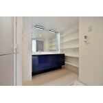 バスルームと色味を合わせ、 LEDの照明でスペース全体を広々とした空間を御提案させて頂きました。