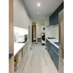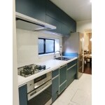 キッチンの長さを短くし、冷蔵庫をキッチンと同じ並びにしたことにより通路が広く確保できました。 キッチンをターコイズブルーに、背面収納は同じターコイズブルーだと少し暗くなってしまうため、あえて色を替え、オリジナルの青のタイルを貼り全体に統一感を出しました。