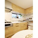 (旧株式会社ハウスドゥでの事例です。)家電の置き場所等をお打合せし、収納力のあるキッチンスペースをご提案。 木目調のキッチンで空間も明るくなりました。